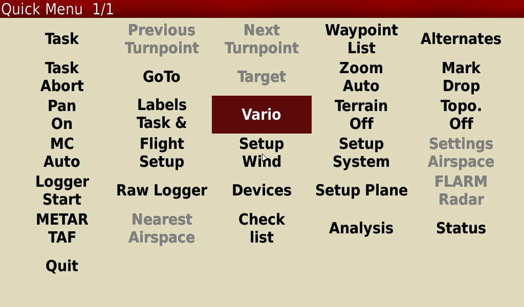 When you boot into XCSoar audio vario is enabled by default. The best way to use it is with a stick remote. Change between vario and speed to fly (STF) with a switch on the remote. A long press on the quickmenu button takes you directly to the vario menu where you can change volume level, set McCready value or mute the vario tone with the four way switch on the stick remote.