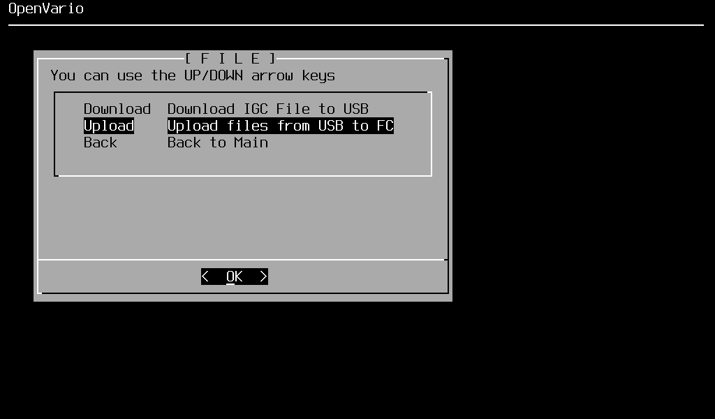 Again, there are many ways to transfer files from your Openvario to somewhere else. The easiest way to download igc files is using the USB thumb drive already prepared. Go to OVmenu and select File → Download. All igc files in the XCSoar data directory (/home/root/.xcsoar/logs) are now copied to directory /openvario/igc on your USB thumb drive.