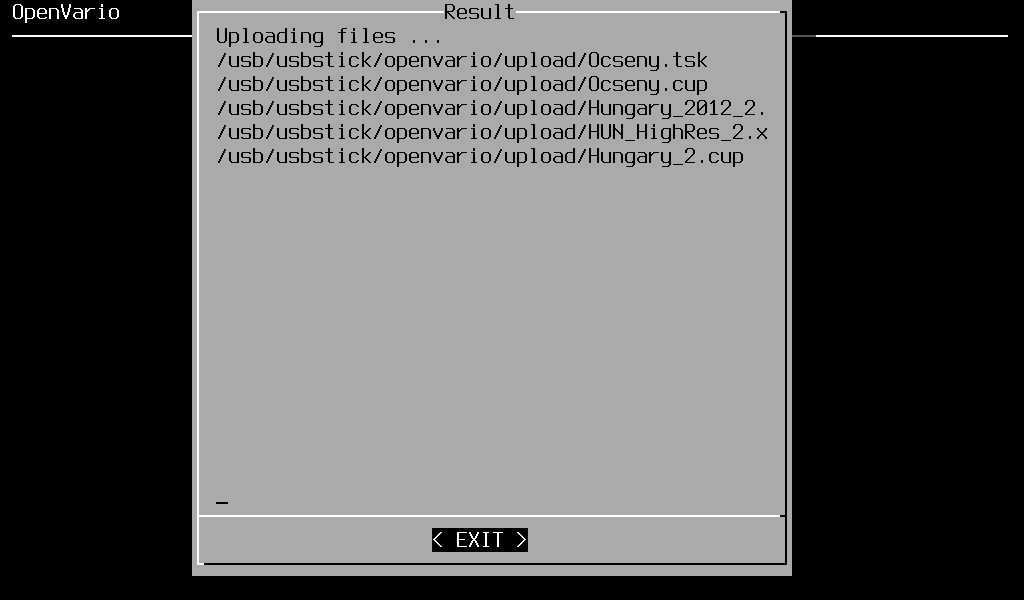 Connect the drive to your Openvario (avoid using a USB hub between thumb drive and Openvario), go to OVmenu and select File → Upload. The files are now copied to your XCSoar directory.