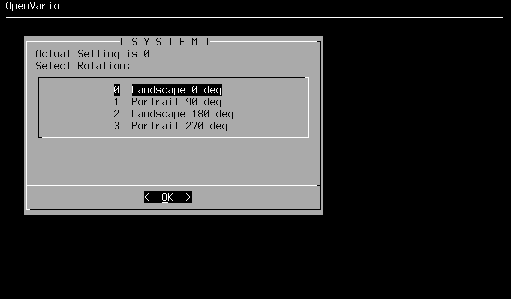 Select System → Settings → Display_Rotation and select your preferred rotation. Reboot your Openvario.Note that this is the only rotation setting that is required, any setting in your XCSoar profile files is ignored!