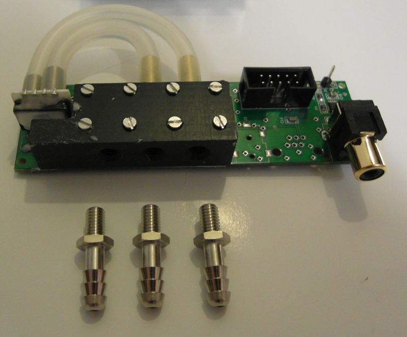 The Block is made from some 1/2“ sheet of black POM, which has excellent machining characteristics and durability. Prepare the basic part as shown in the DXF, ream the 2.9mm holes for a slight press fit of 3mm brass tubes and cut M5 threads for the barbed tube connectors. Before you start sealing the POM-Block, electrical testing of the Sensorboard is recommended.