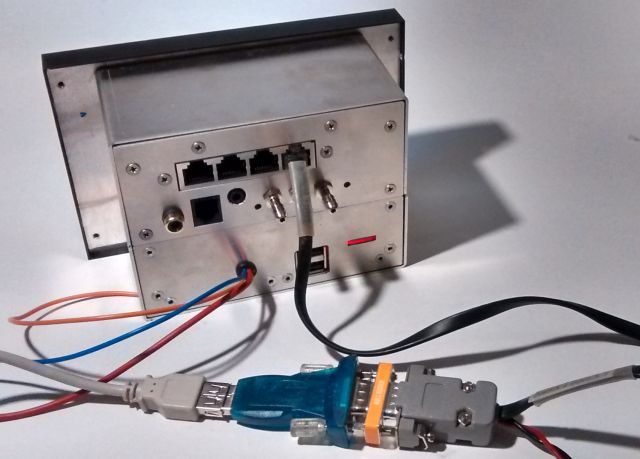 If your adapterboard and RJ45 board work there is no need to open the housing, you can access the serial console on the UART0 RJ45 connector. Use a serial cable for a logger (Volkslogger, Flarm, etc.) and a Nullmodem cable/adapter (the orange colored part in the picture below) to connect to your computer.