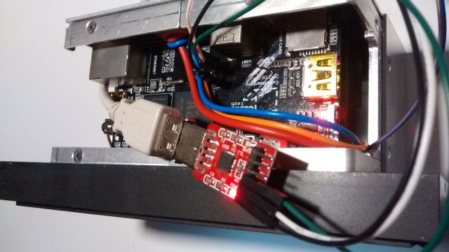 Even without any screen connected we can check on the serial console if the system boots. Remove the housing lower cover to get access to the UART0 pins on the Cubieboard and connect jumper wires for RX, TX and GND to a 3.3V TTL serial to USB converter. Do not connect anything to the Vcc pin! Since you access UART0 directly on the Cubieboard this works even if you messed up the level converters on the adapterboard, the RJ45 board or the ribbon cable connecting them.