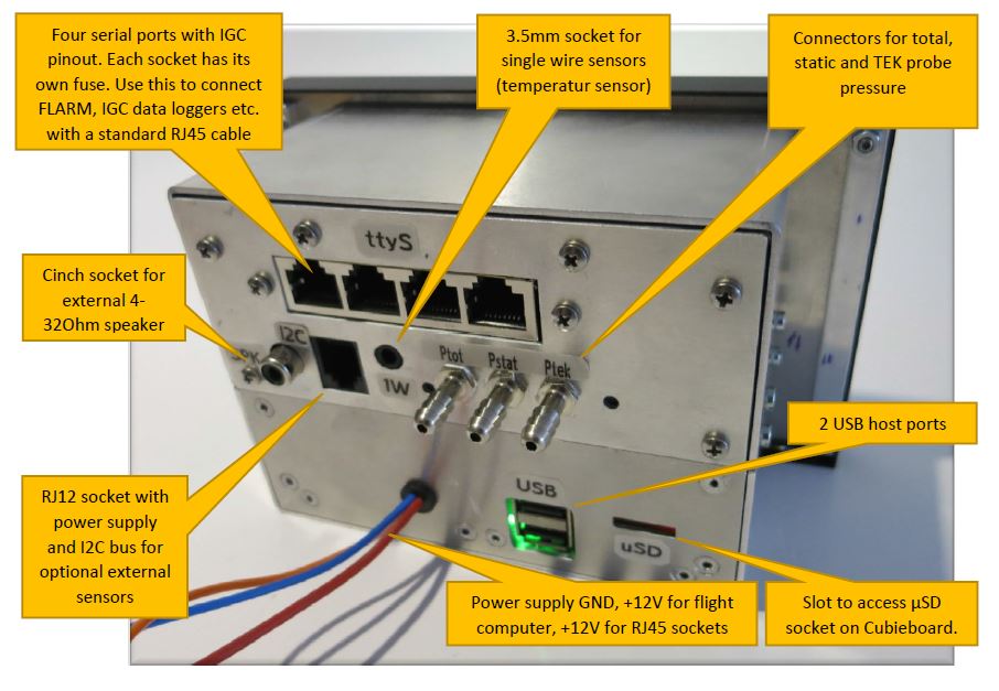 Easily connect up to four devices (FLARM, IGC Loggers, E-Varios, etc.) with simple standard RJ45 cables only
